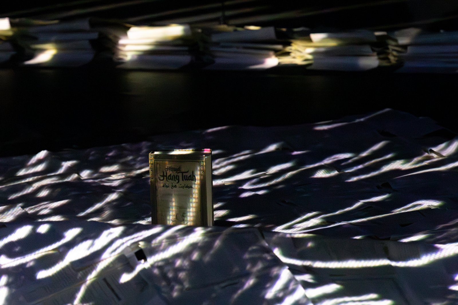 As the notes of the final song, Kan Ku Hilang, gradually merge with the gentle sounds of waves lapping along the humanmade paper shorelines, we see animated Jawi script emerging from the woven pages, little flecks of light dancing, converging and reconstituting, ebbing and flowing, every now and again disappearing, yet somehow conspicuously alive.