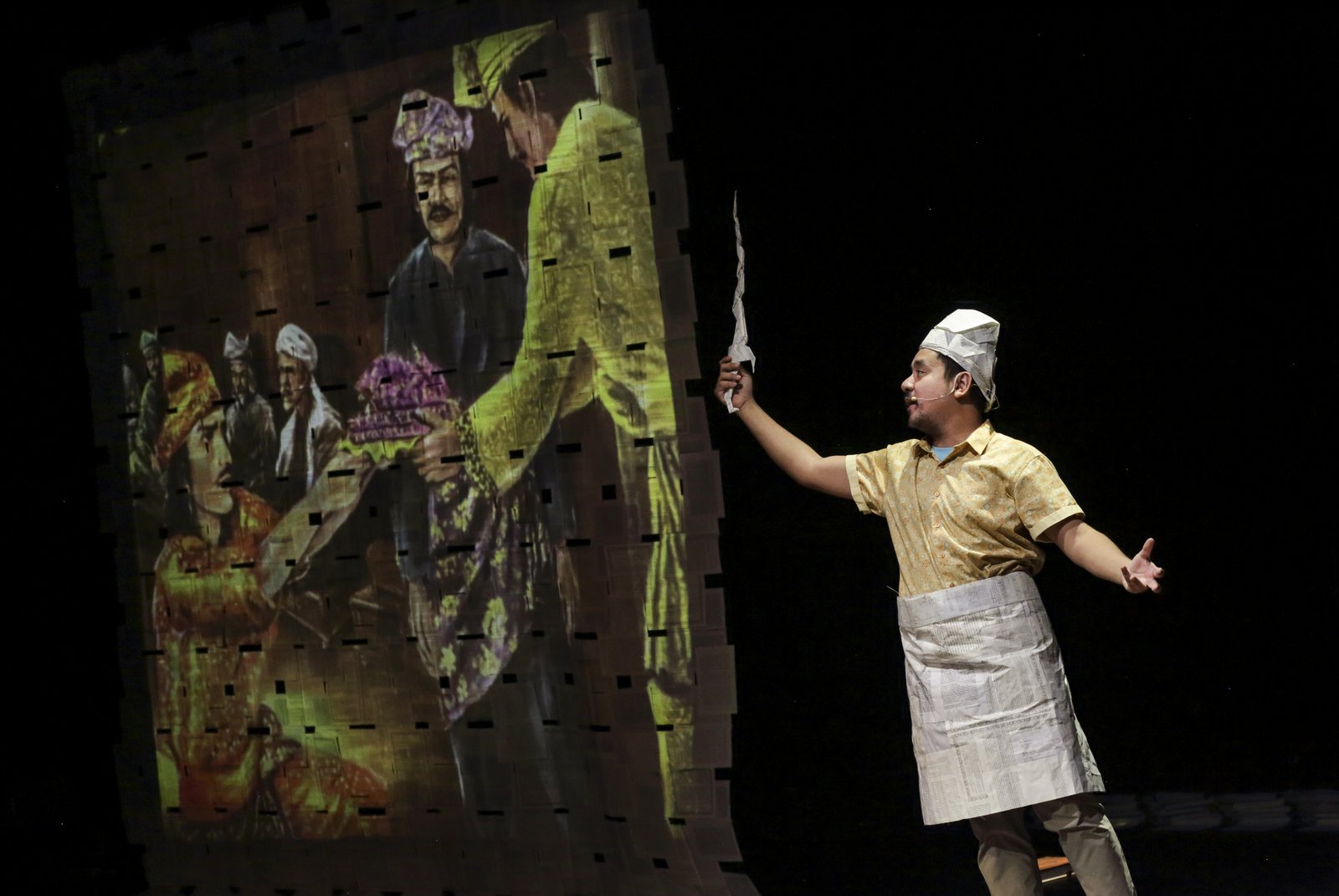 At times he is circumspect and unassuming, directly addressing the audience in a convivial manner; at other times he has a larger-than-life presence, his gestures grand and expressive, as he moves with an unbridled kinetic force across the stage. There is also Faiq the actor and musician projected on paper screens, playing different parts while donning his digital creator hat, looking way more animated and facially expressive; this mediated two-dimensional charisma of his compels us, but it definitely plays second fiddle to his onstage one.