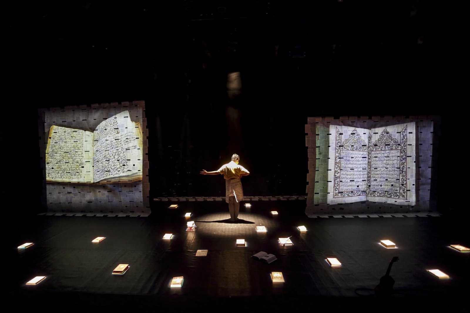 Books are windows into new realms of ideas and stories, but they are also a bulwark against obsolescence. Inasmuch as they help to fortify our opinions and perspectives, they can also be walls erected to imprison us in them. Wong plays with these ideas in her production design by weaving pages of books together into giant tapestries that also function as screens for Syam’s multimedia projections.